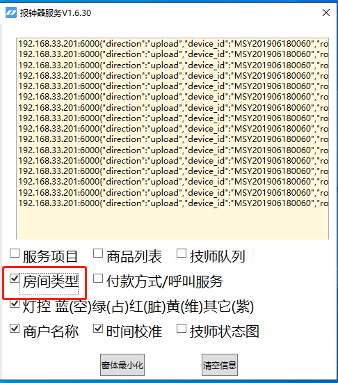 | 处理方法1:检查房间是否派工,派工后对应的项目技师是是否正确; 处理方法2:如果已派工并且技师也正确,检查网络是否连接, ⑴、网络连接是否正常; ⑵、网络连接正常、检查服务器电脑的报钟器服务是否开启; |