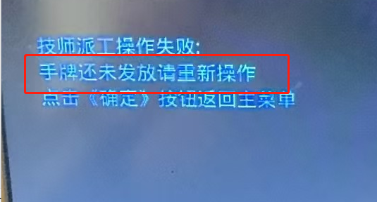 | 问题描述:部长刷卡报钟器派工,提示技师派工操作失败:手牌还未发放请重新操作 |