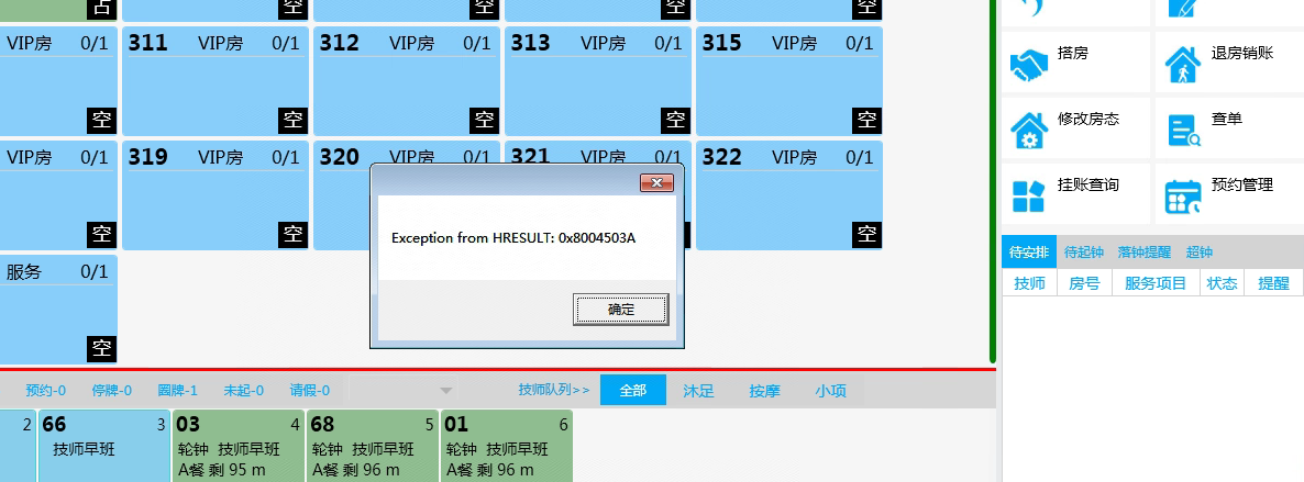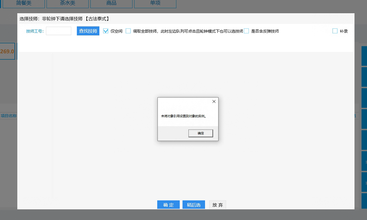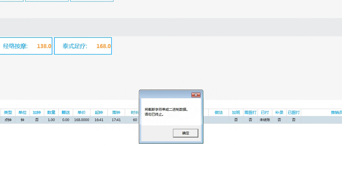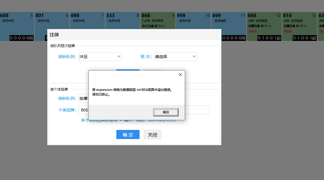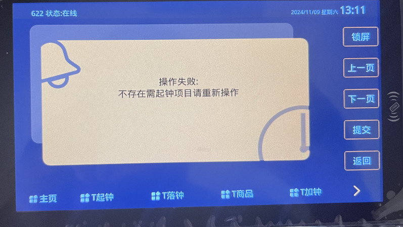 | 问题描述:技师刷卡报钟器起钟,提示技师起钟操作失败:不存在需起钟项目请重新操作 |