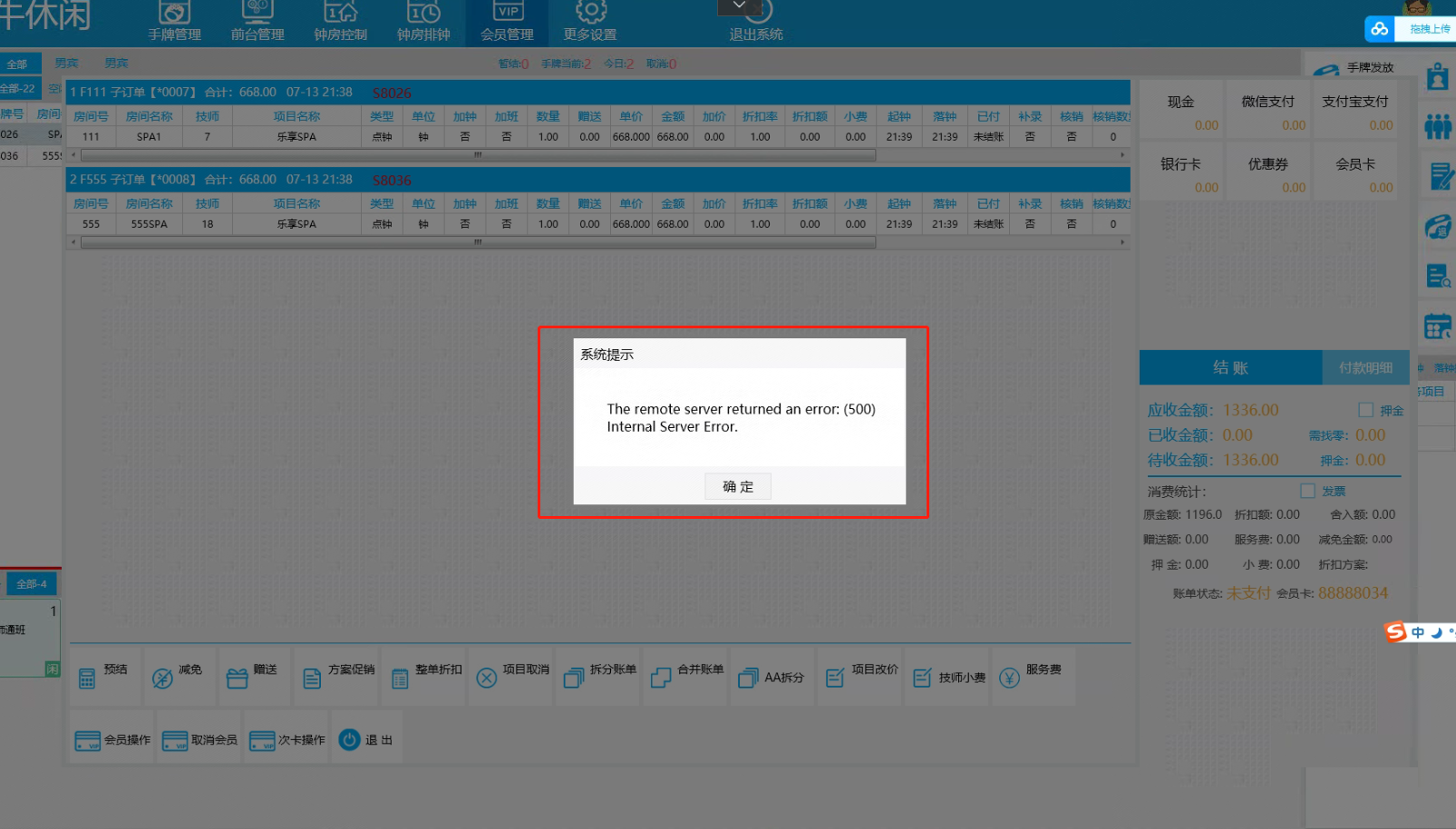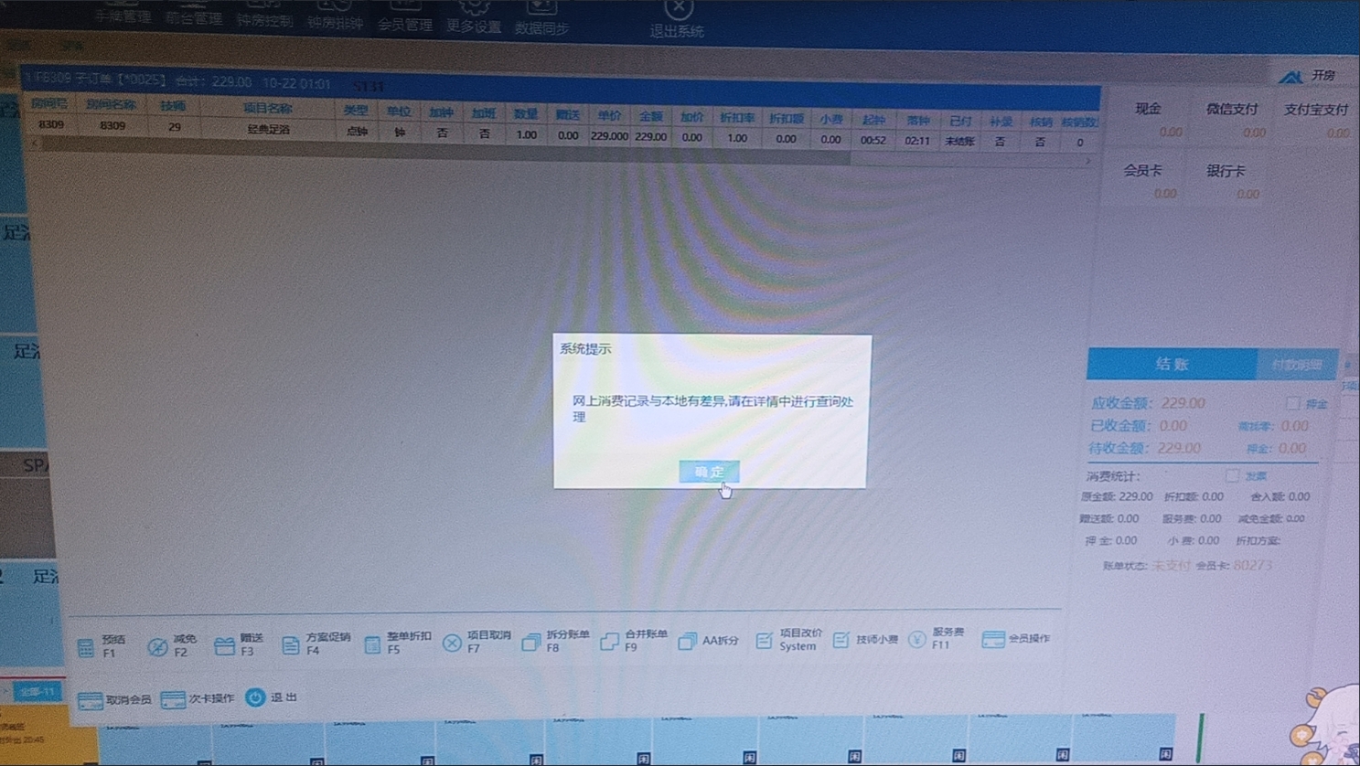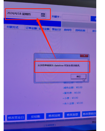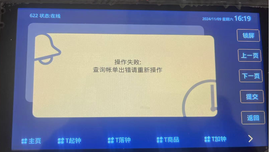 | 问题描述:z7报钟器部长刷卡操作换项目报错,操作失败:查询帐单出错请重新操作 |