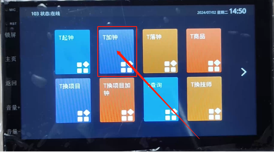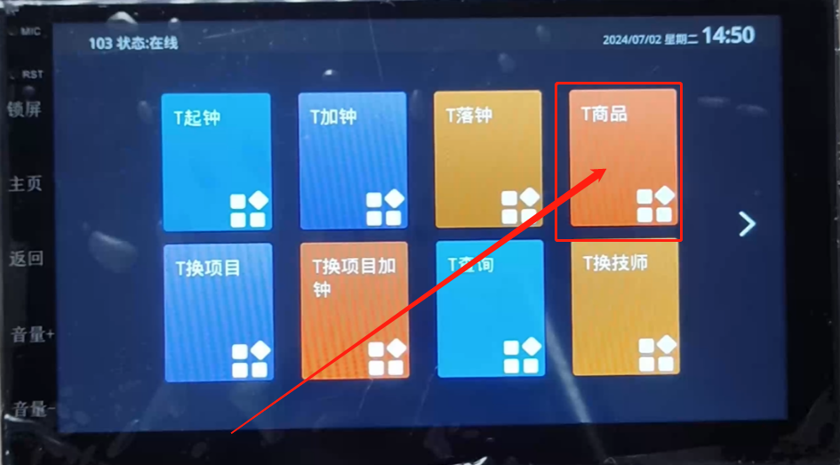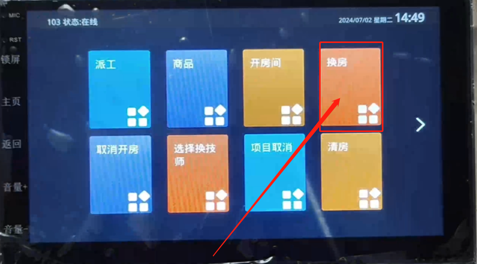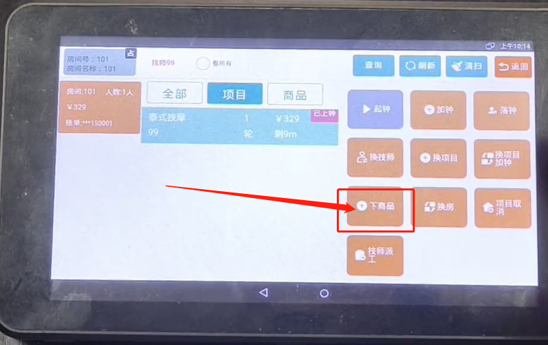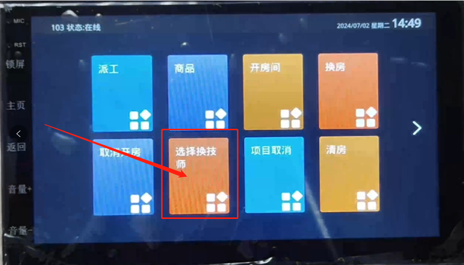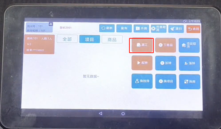 | 处理方法:部长在报钟器上刷卡,点击选择换技师,选择对应的项目点击项目,系统会自动更换技师; |