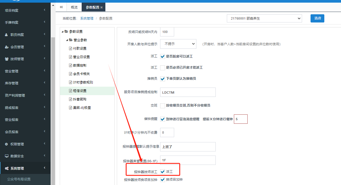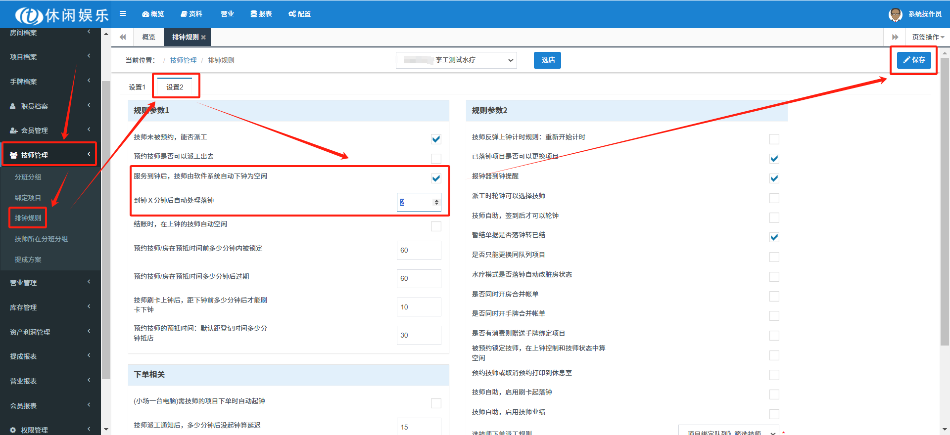 | 在后台的 ”技师管理-排钟规则” 页面,点击设置2,勾上图片标出的服务到钟自动落钟参数,设置输入到钟后多少分钟自动落钟,最后点击右上角保存即可 |