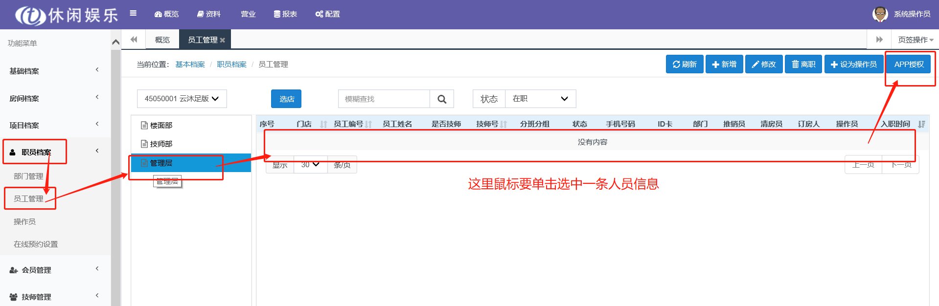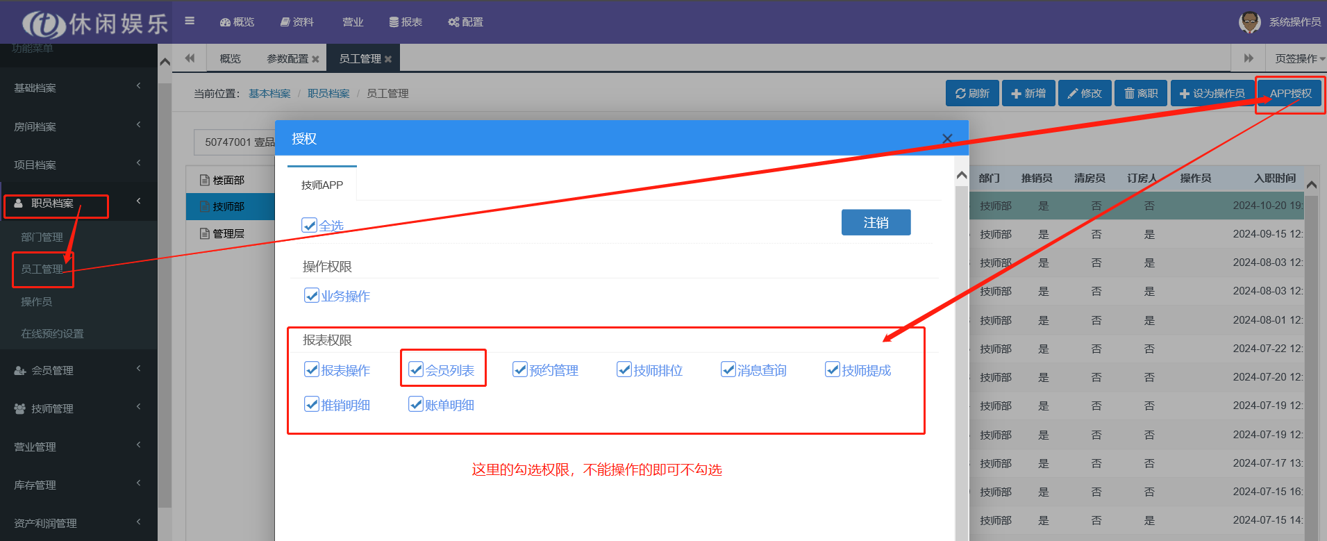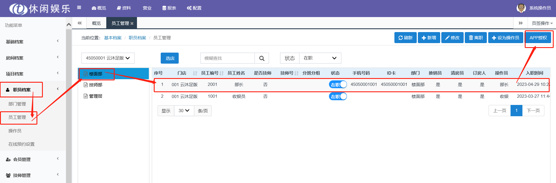 | 后台系统-职员档案-员工管理-选择“楼面部”人员信息,授权相对应部长APP |