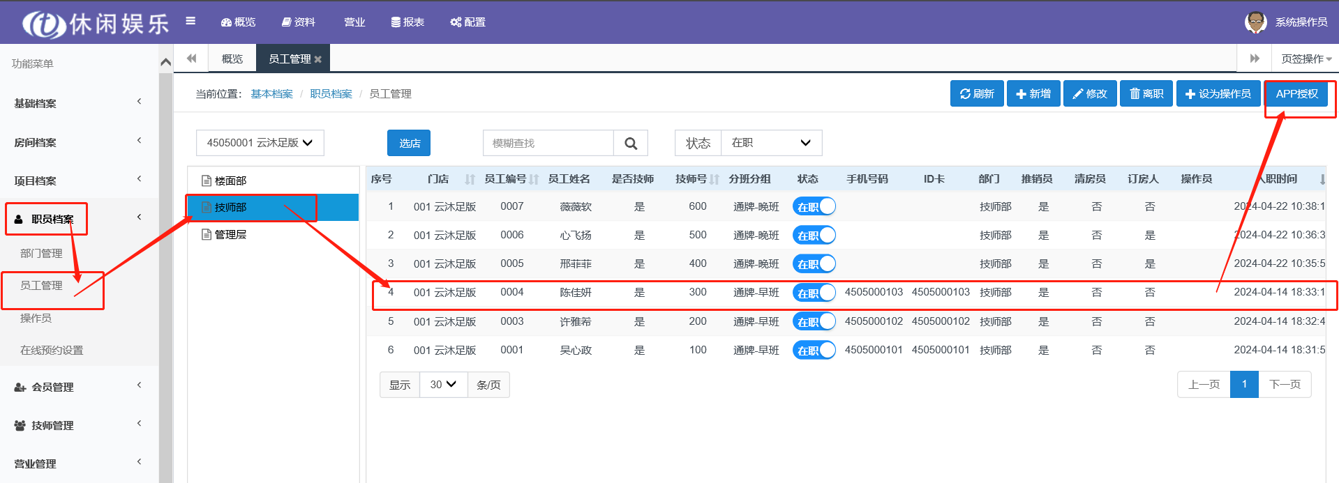 | 后台系统-职员档案-选择“技师部”门人员信息,授权技师APP |