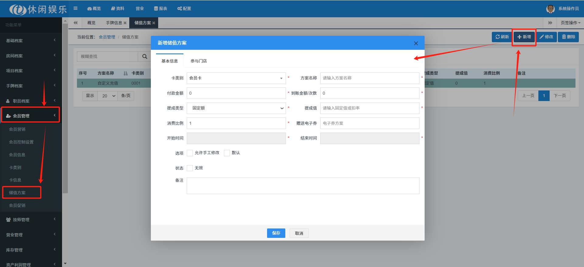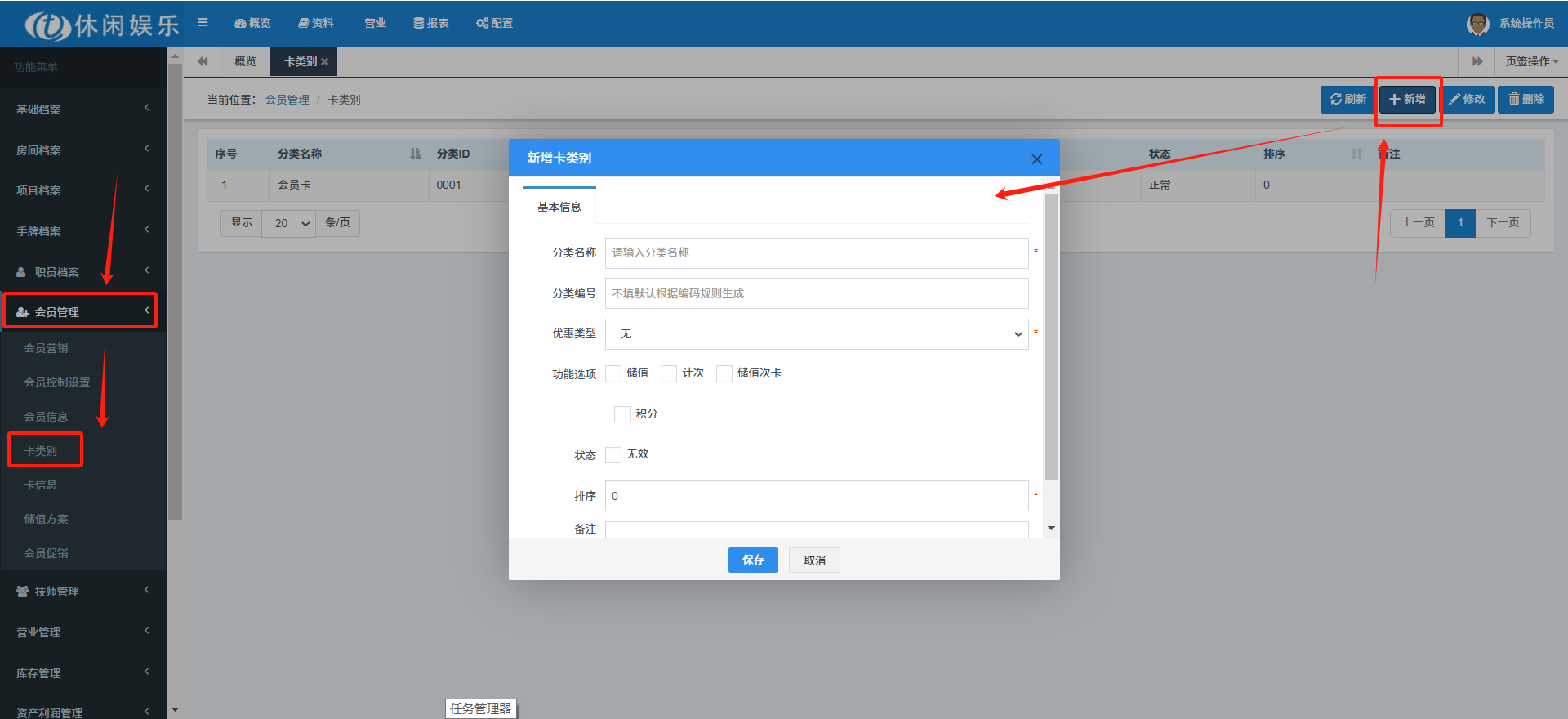 | 在后台的 ”会员管理-卡类别” 页面,点击新增按钮进行添加 |