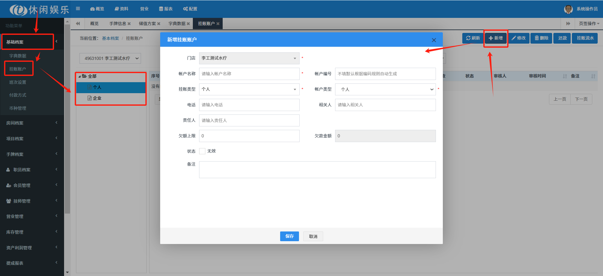 | 在后台的 ”基础档案-挂账账户” 页面,选到对应账户类型,点击新增按钮进行添加 |