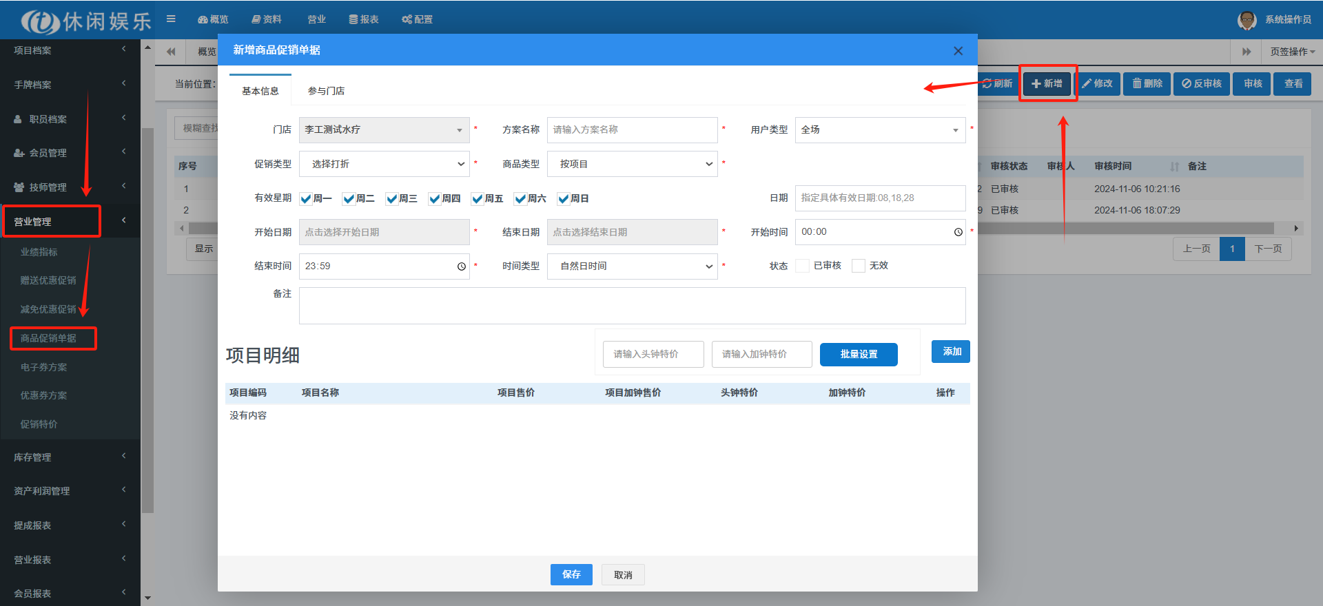 | 在后台的 ”营业管理-商品促销单据” 页面,点击新增按钮进行添加 |