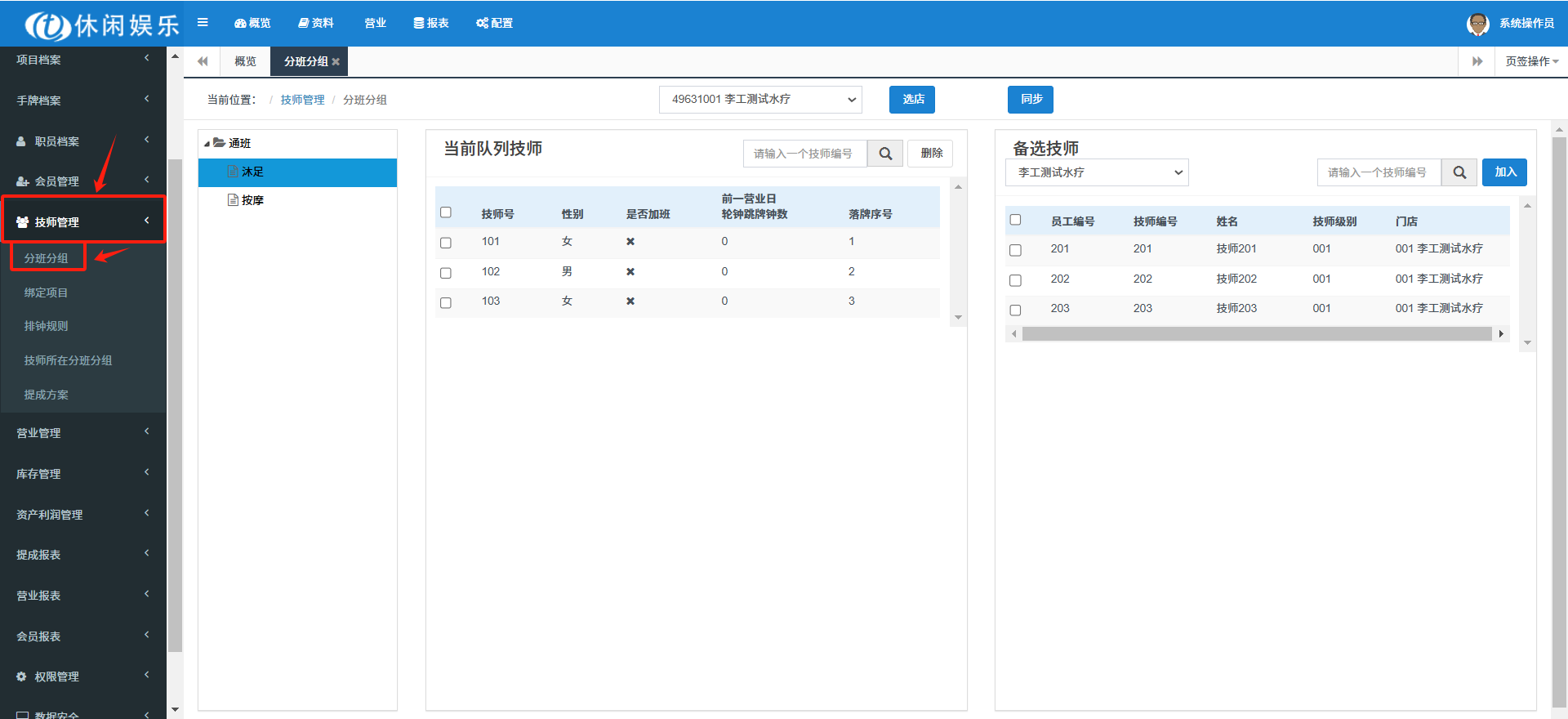 | 在后台的 ”技师管理-分班分组” 页面,给技师分班次分队列 |