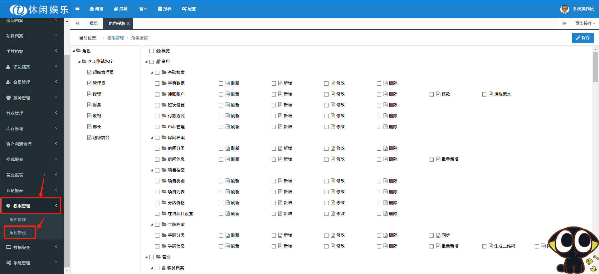 | 在后台的 ”权限管理-角色授权” 页面,给对应角色进行授权勾选 |