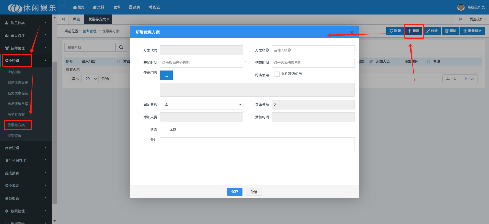 | 在后台的 “营业管理-优惠券方案” 页面,点击新增按钮进行添加 |