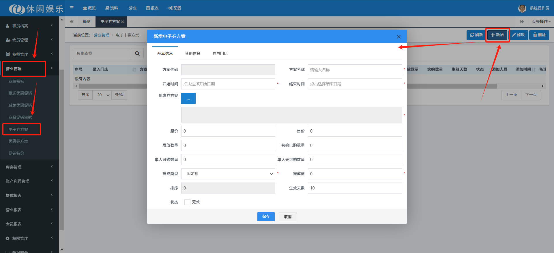 | 在后台的 ”营业管理-电子券方案” 页面,点击新增按钮进行添加 |