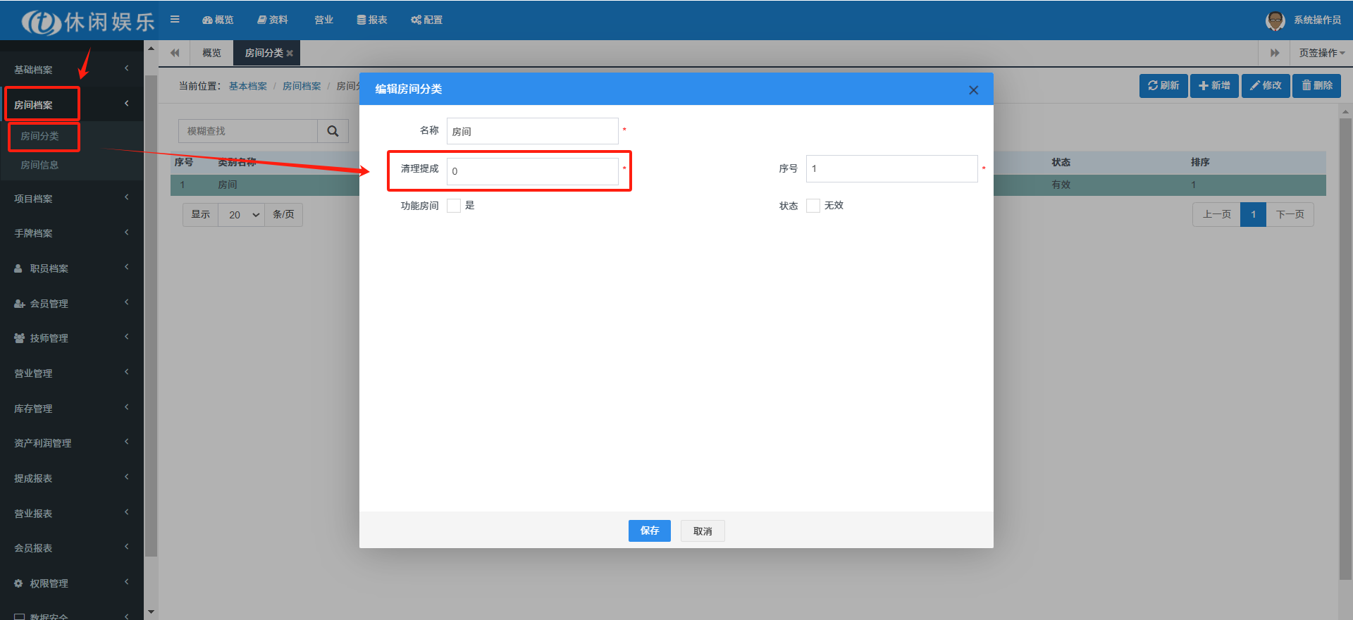 | 在后台的 ”房间档案-房间分类” 页面,双击对应房类,设置房类的清房提成 |