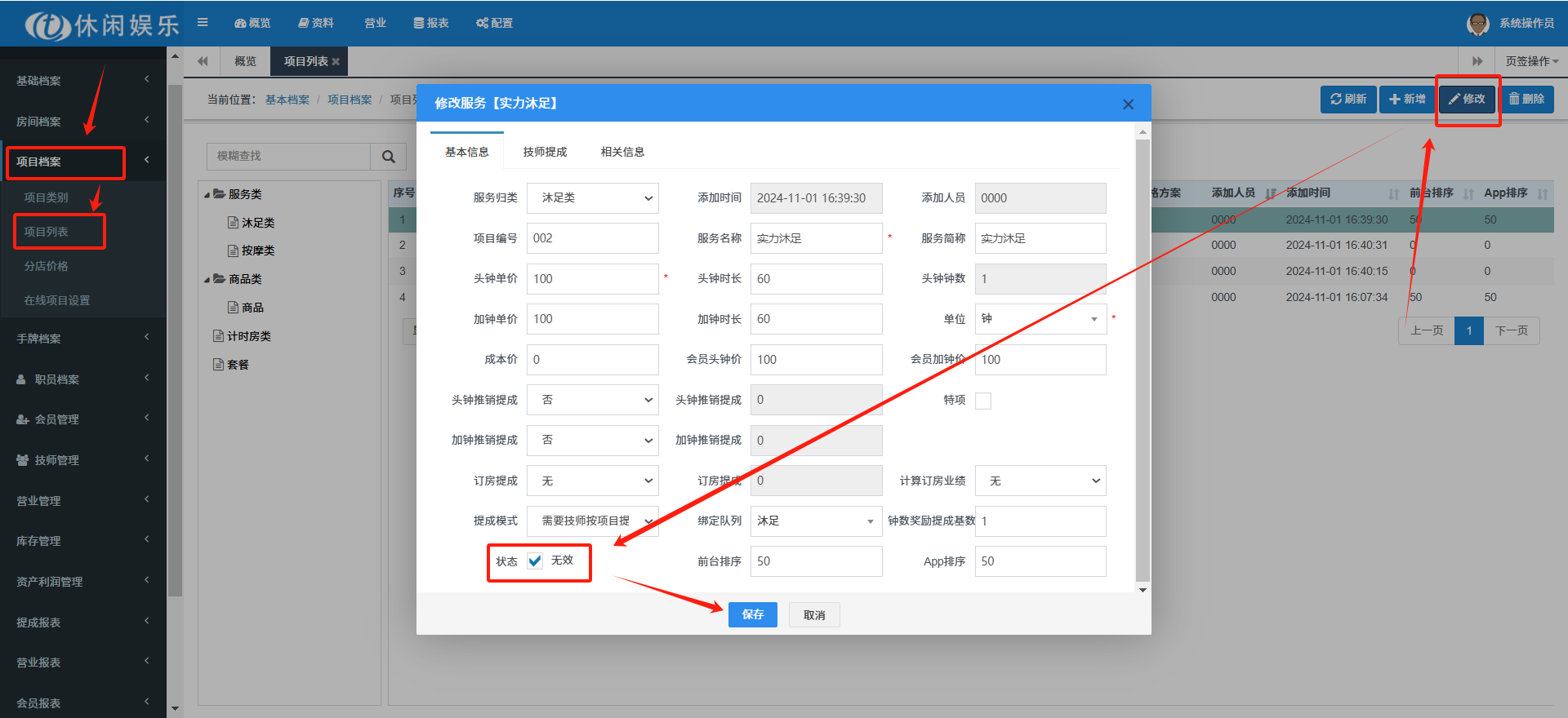 | 在后台的 ”项目档案-项目列表” 页面,点击修改按钮,勾上对应项目的状态为无效即可 |