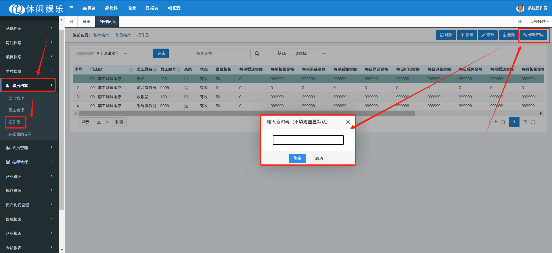 | 在后台的 ”职员档案-操作员” 页面,选择对应账号,点击右上角修改密码按钮 |