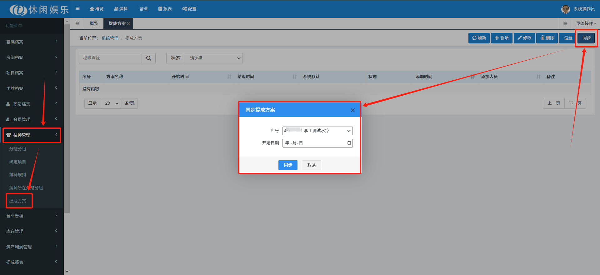 | 在后台修改对应项目的技师提成,然后再去“技师管理-提成方案” 点击右上角同步按钮进行同步 |