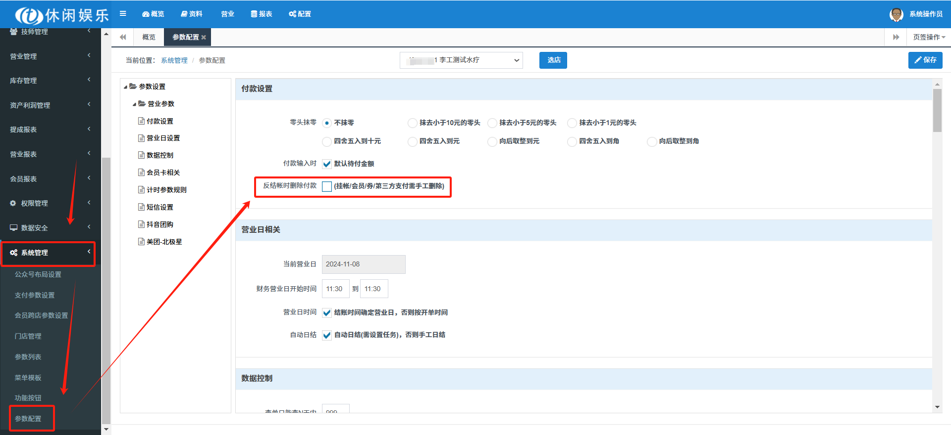 | 在后台的 ”系统管理-参数配置” 页面,找到反结账时删除付款的参数,勾上进行保存即可 |