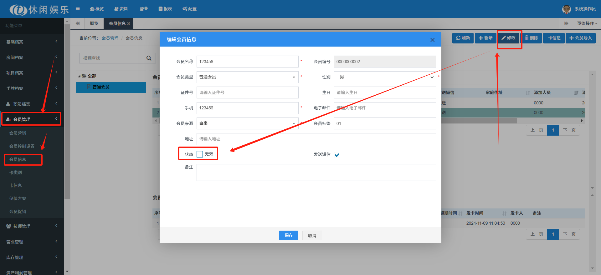 | 在后台的 ”会员管理-会员信息” 页面,找到对应要删除的会员信息,修改状态为无效即可 |