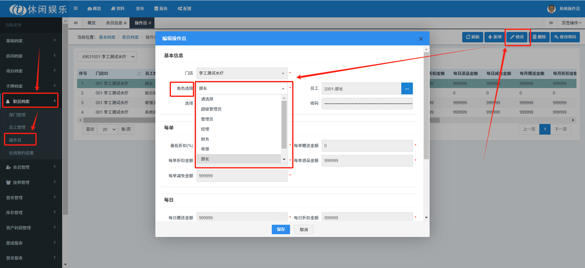 | 在后台的 ”职员档案-操作员” 页面,找到操作员账号,点击右上角修改按钮,角色选择这里进行选择 |