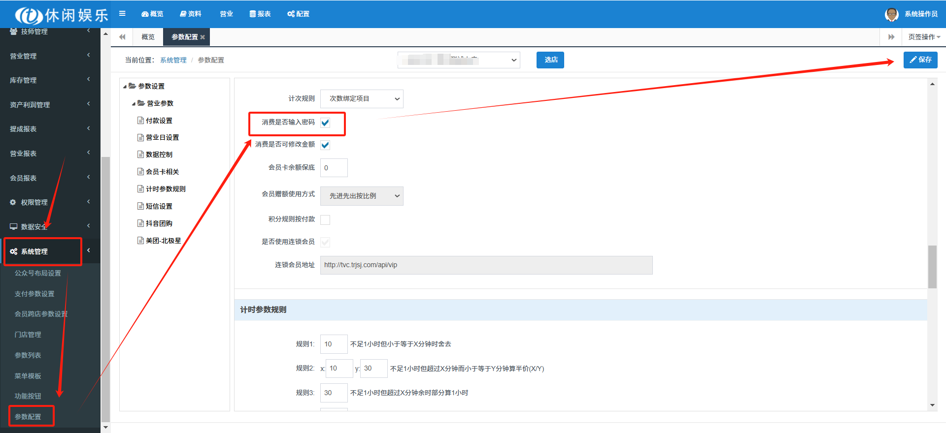 | 在后台的 ”系统管理-参数配置” 页面,下滑找到消费是否输入密码的参数,勾选然后点击右上角保存即可 |
