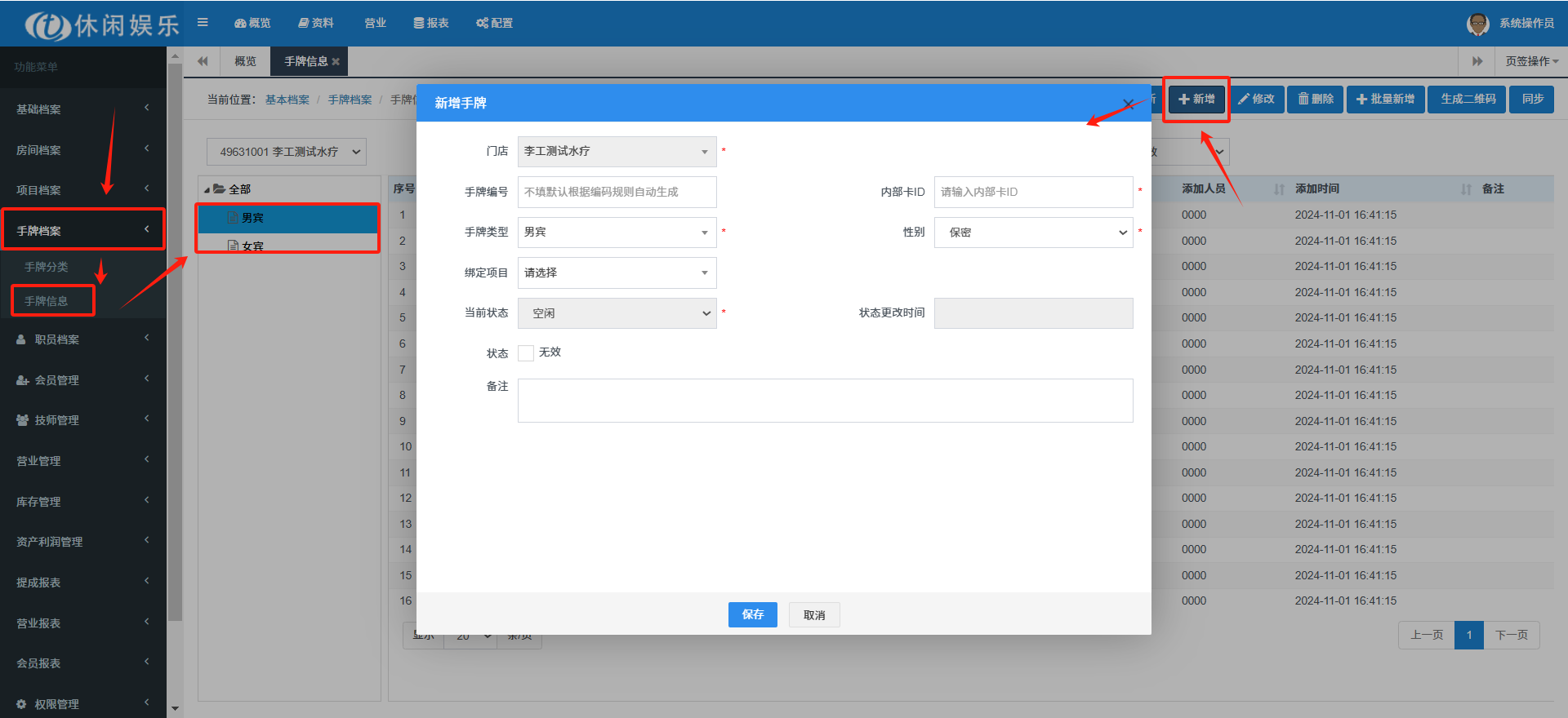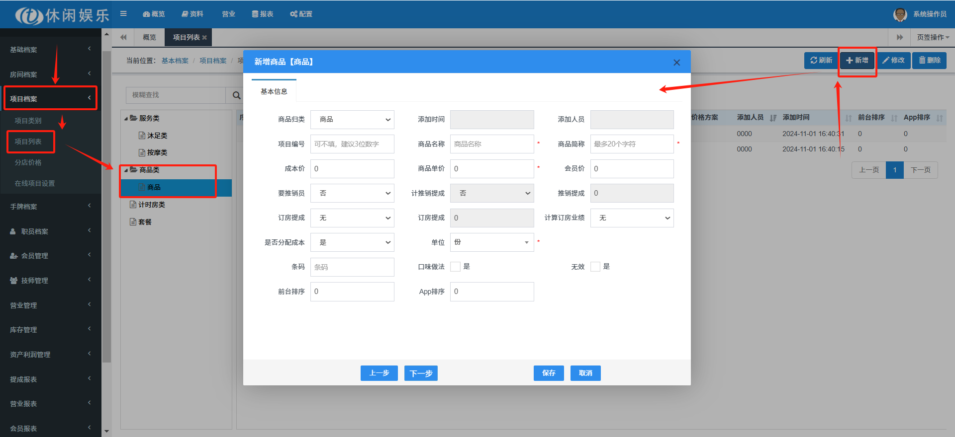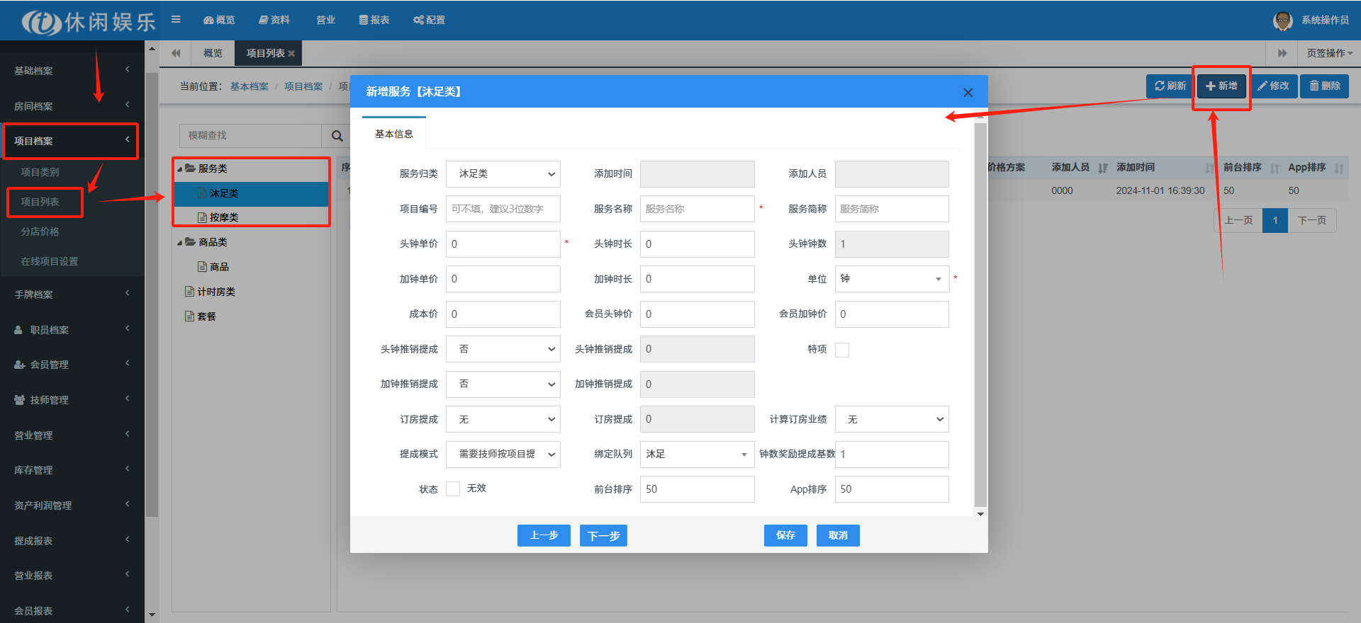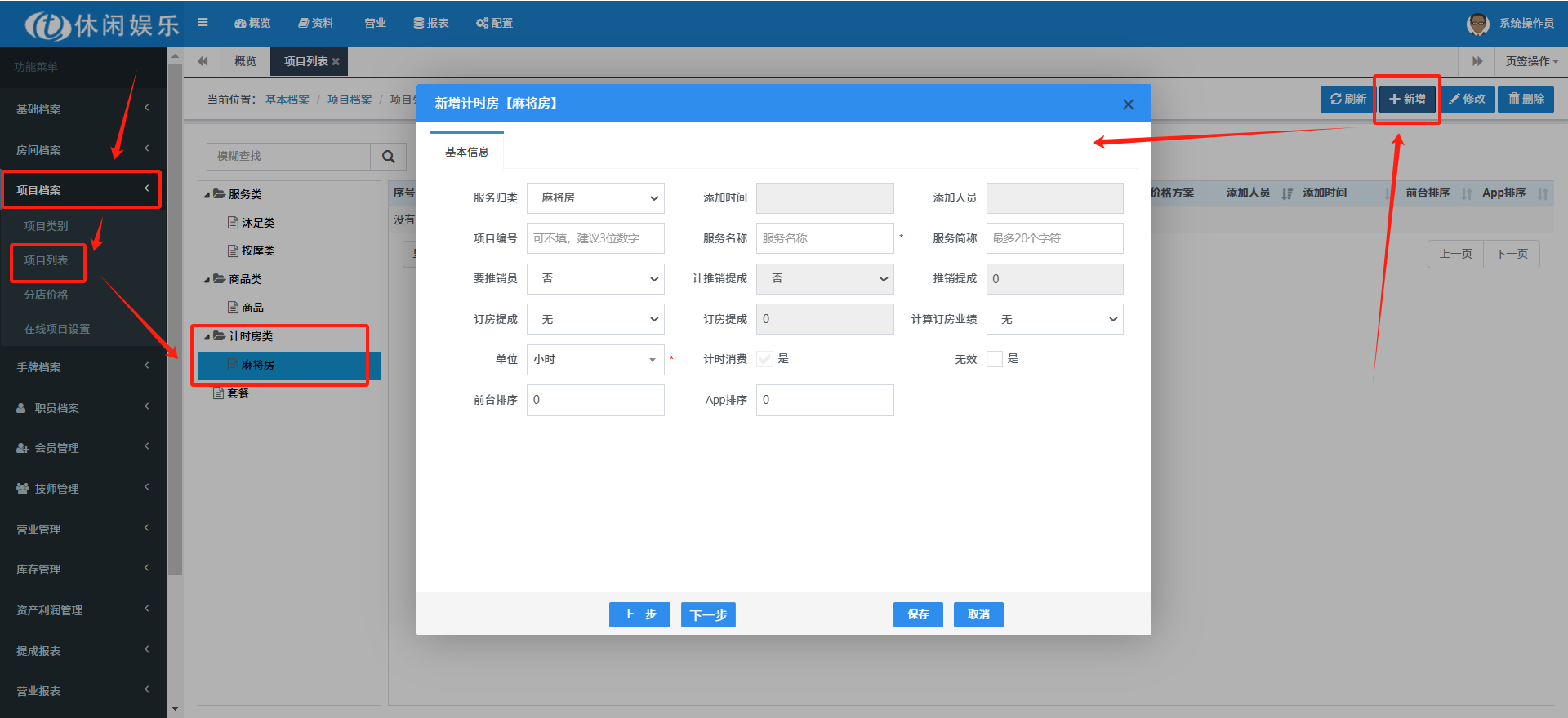 | 在后台的 ”项目档案-项目列表” 页面,找到计时房类,找到对应计时房小类,点击右上角新增按钮进行添加 |