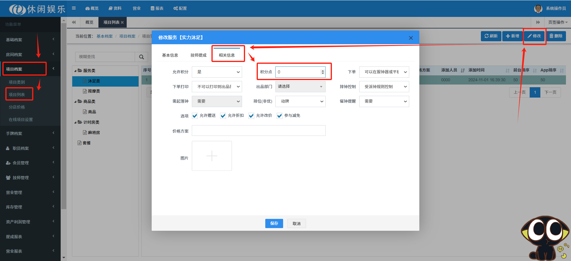 | 在后台的 ”项目档案-项目列表” 页面,找到需要设置消费积分的项目,点击修改按钮,找到相关信息页面,输入积分点 |
