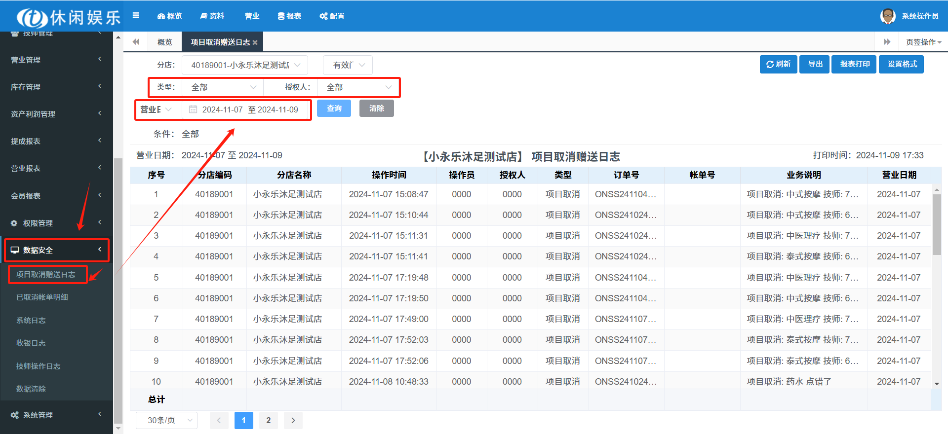 | 在后台的 ”数据安全-项目取消赠送日志” 页面,选择要查询的类型和日期,点击查询即可 |