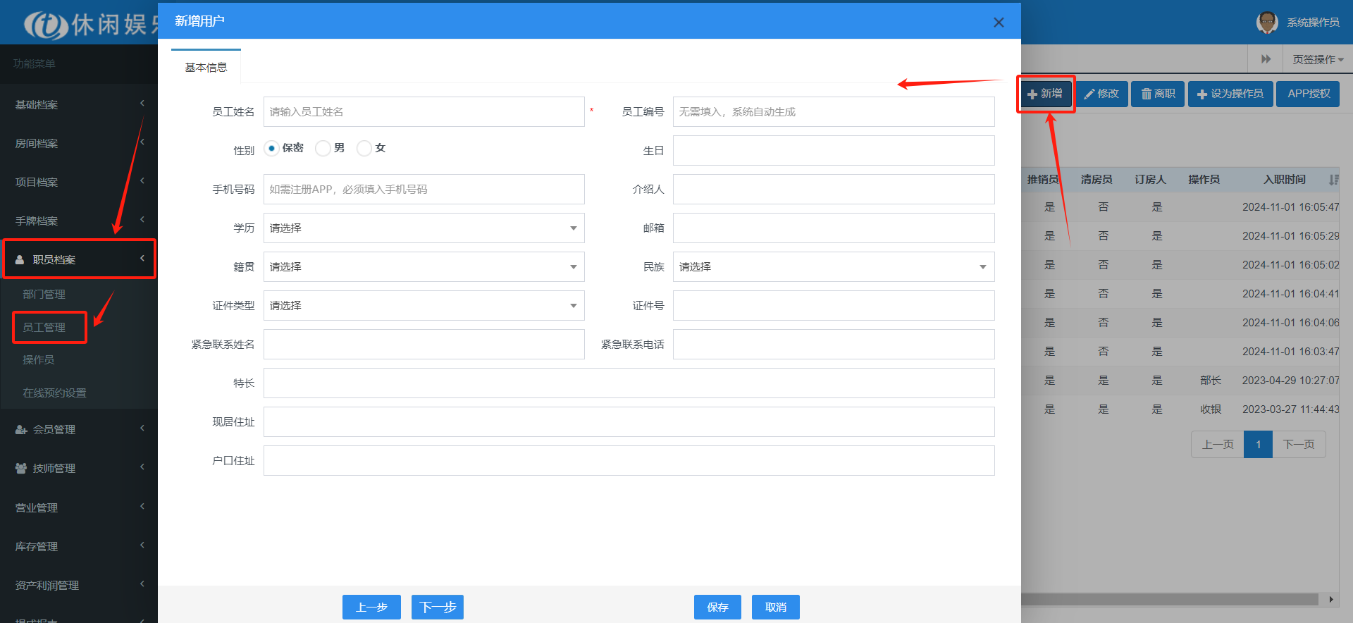 | 在后台的 ”职员档案-员工管理” 页面进行添加 |