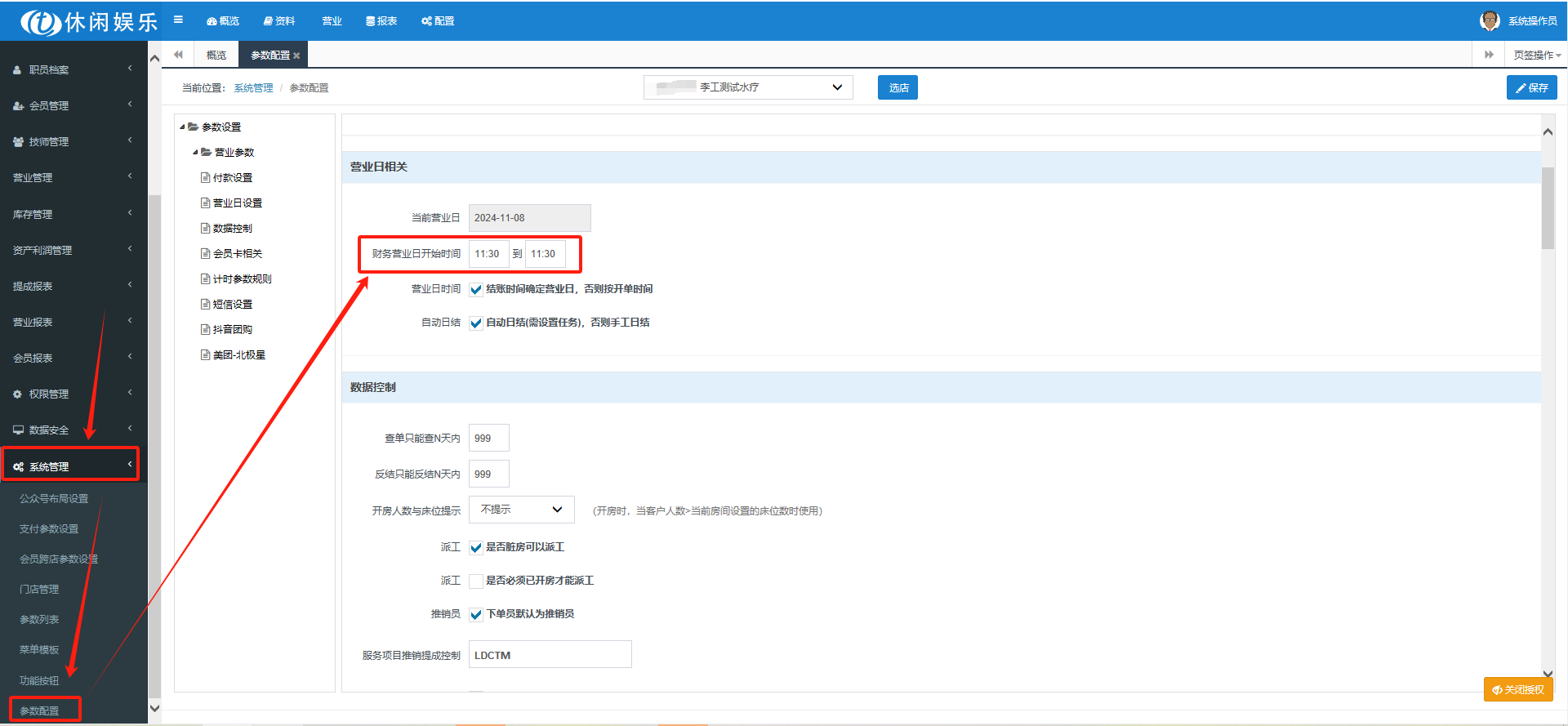 | 在后台的 ”系统管理-参数配置” 页面,找到财务营业开始时间,设置营业开始和结束时间,注意开始和结束时间需要一致,如果是按照正常24小时,需要设置为00:01到00:01,注意不要使用中文冒号,使用英文的冒号 |