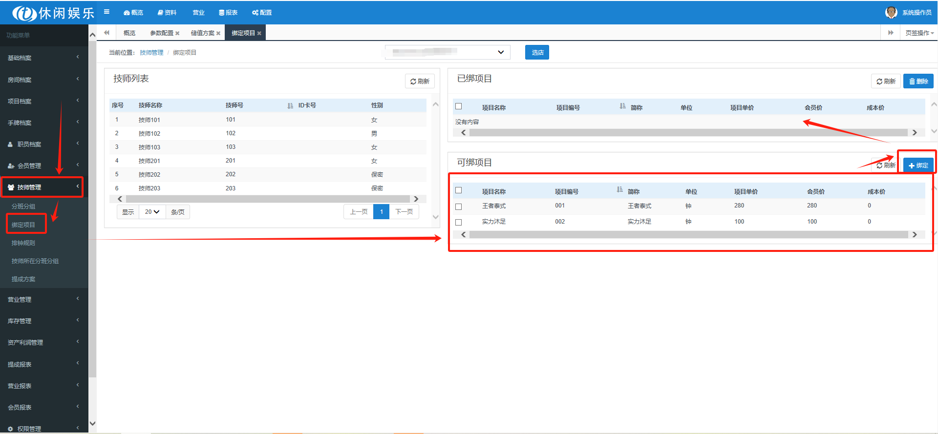 | 在后台的 ”技师管理-绑定项目” 页面,选中对应技师,勾选需要绑定的项目,点击绑定按钮进行绑定 |